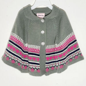 Cute Little Lass Gray Pink Fair Isle Print Poncho Cape Sweater Baby Girls Sz 18 Months with front rhinestone buttons. In excellent previously worn condition.