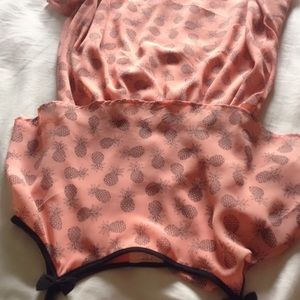 Orange layered dress with pineapples on it. Has two bows on bottom of straps. It has two layers. Very flowy. Size small but will defiantly fit medium or large. Has elastic band on waist. Worn a couple of times. If you have any questions regarding this listing, or others, please feel free to contact me ! ๐