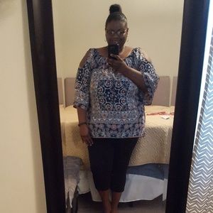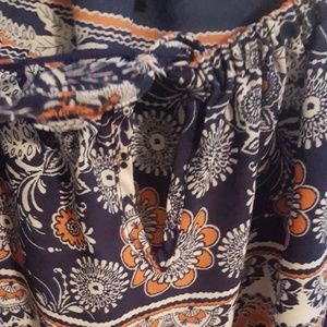 Navy/Coral Print Pattern Blouse with key hole/ tie at neckline, Peek-a-Boo 3/4 Sleeves. L 27" Hips 31" Chest 28"