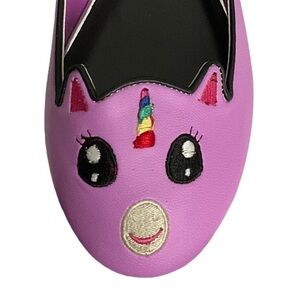 These perfect purple and rainbow embroidered flats add a pop of fun to any outfit. Rainbow horn detail with Kawaii eyes.