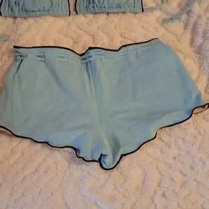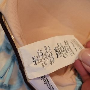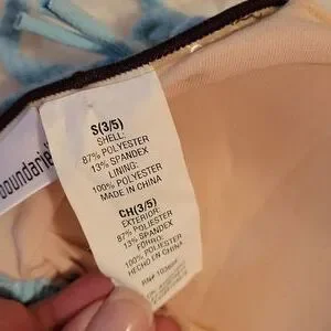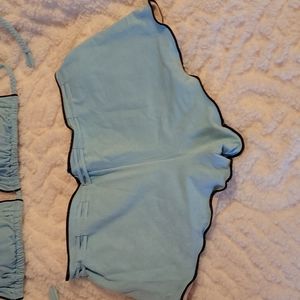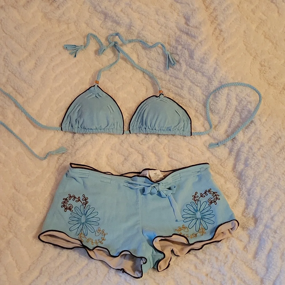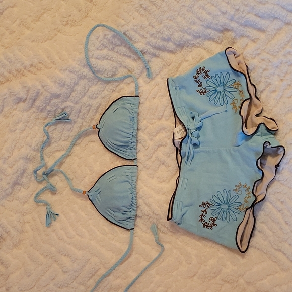 turquoise with brown trim "soft feel" bikini. I wore it one time. when I bought it I must have thought I was buying it for a different body! 🤣 SO SUPER CUTE though! no stains or wear and tear at all.