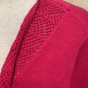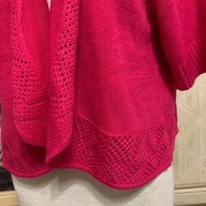 Cute sweater, short style with crochet around the him, line and all the way up around the neck. Great for a summer evening in a fuchsia color, soft 100% acrylic machine washable size large.