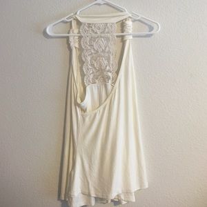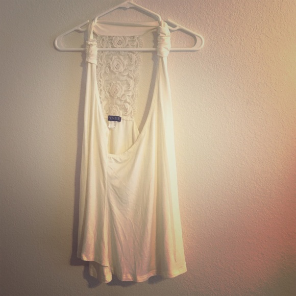 Venus cute top, with lace on the back. Very flattering, slightly see through though. Only worn once or twice. It says size M so I think it's about a 4. White/ cream color.