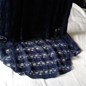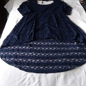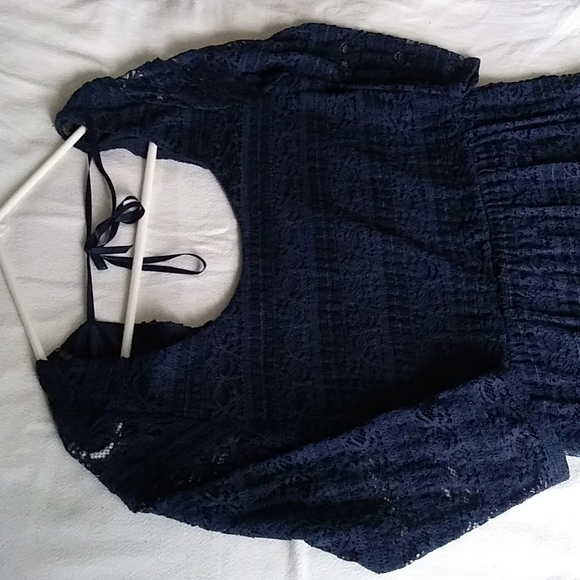 Navy Blue lace long short dress with 3/4 length sleeves. Back ties at neck w/ a little exposure to mid back. Tapered waist and length right below mid thigh. #BIGGURLSTATUS