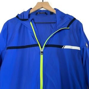CUTTER & BUCK Men's Breaker Sport Stretch Jacket Blue with Black and Fluorescent Yellow Accents Size Medium Golf UPF Hood