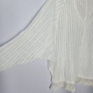 white semi-sheer - lace detail around bottom - 100% polyester - batwing dolman sleeves - beach / tank cover up - v neck - oversized - hooded - side vent slits - lightweight
