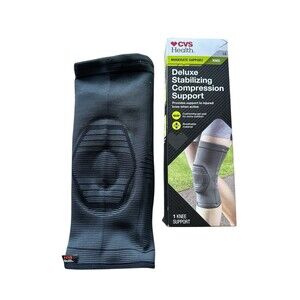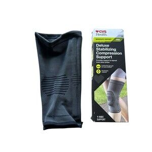 New in open box- box shows some wear at top. Moderate support knee brace, deluxe stabilizing compression support. Adult size large fits calf range 16-18" and thigh range 18.5-20.5". Measure 4 inches from center of kneecap down calf and up thigh. Gel pad at kneecap provides cushioning comfort and targets compression. Anti slip silicone gel keeps support in place, 3D knitted 4 way stretch material provides optimal fit and compression. Dual side spring inserts provide stable support for knee joint. Stored in a smoke-free environment.