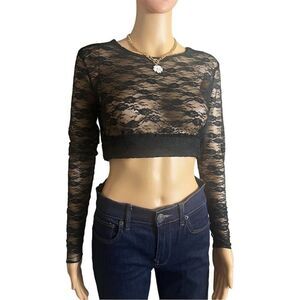 CW Classics Women's Lace See-Through Long Sleeve Crop Top Black Medium