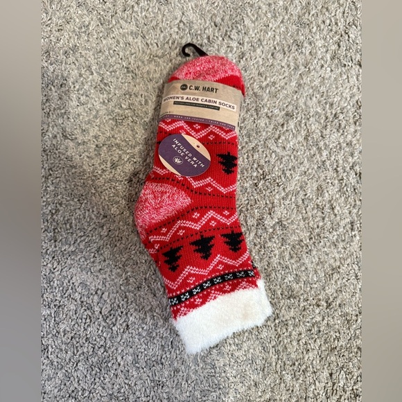 Cozy red cabin socks with festive patterns. Perfect for winter warmth.