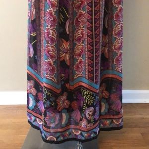 A beautiful chiffon dress for any occasions. Rich color combo and print give it an upscale bohemian flair. Many nice details, 3/4 sleeve, full detached black slip dress. Great Condition.