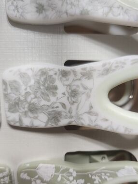 In thus purchase you will receive 6 beautifully decorative bag clips.There are 3 sets of differing springtime and into summertime flowers.They are in 3 different varying shades of sage green.Jyst lovely.All of the clips are also magnetic,making them each multifunctional. B.N.W T.