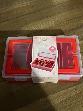 CWC (Cook With Color) labeled multi-compartment storage box. Bright red removable dividers and clear lid. Great for meal prep or organized storage. Compact and stackable design.