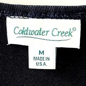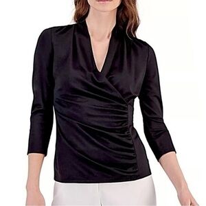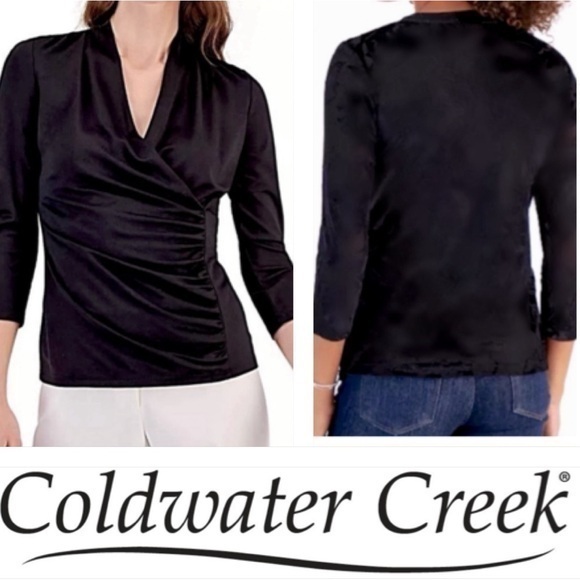 Gorgeous and classic Coldwater Creek black faux wrap top. Nice draping & ruching for a beautiful silhouette. Can be dressed up or down for multiple occasions. 25” from Shoulder to Hem. 19" Sleeves.