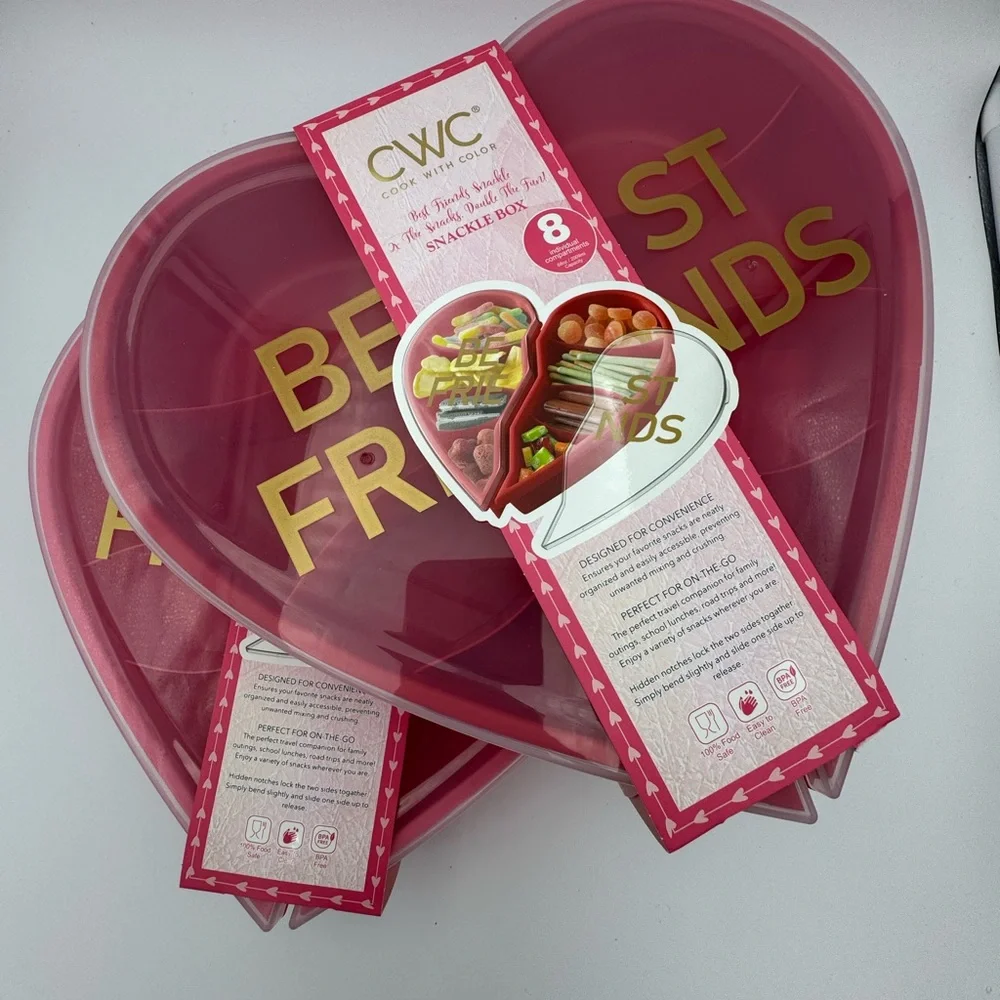 CWC heart-shaped snack box. 2 box set in pink and red with gold lettering “Best Friends”. BPA Free. 11” wide. 8 compartments. Perfect for sharing treats.