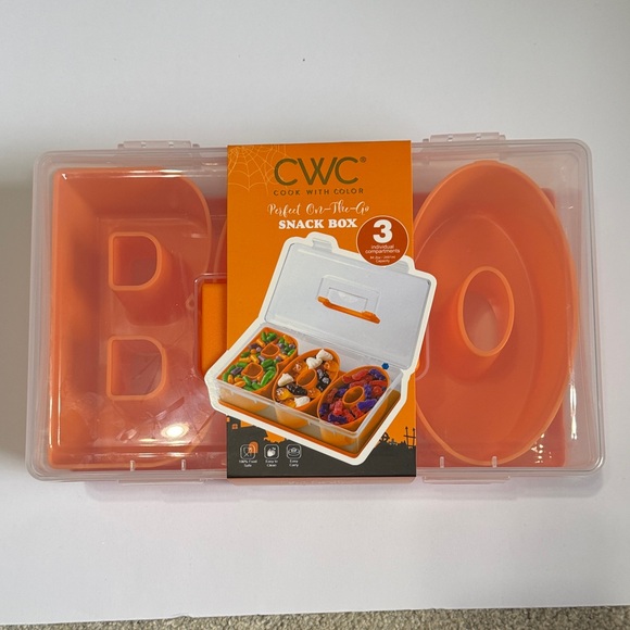 CWC orange snack box with three removable compartments. Durable, food-safe design for organized snacks and lunches. Bright orange color adds fun to meal prep. Easy to clean and convenient for on-the-go use.