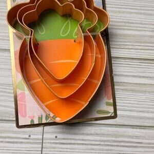 Set of three carrot-shaped cookie cutters. Vibrant orange color.