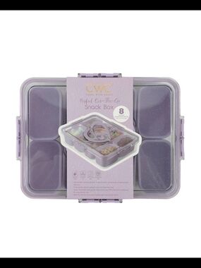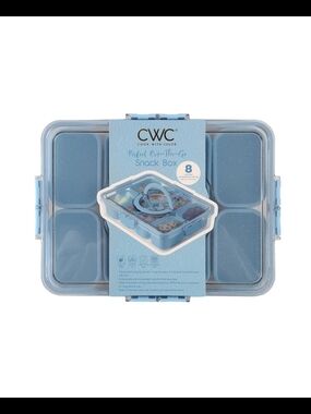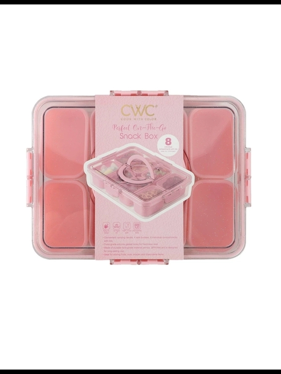 CWC pink 8-compartment on-the-go snack box for organized snacking. Lightweight and portable for easy meal prep and portion control. Secure latches keep contents sealed during travel. Dishwasher-safe compartments for quick cleaning.