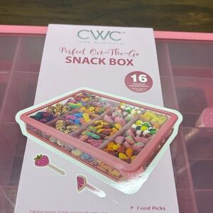 CWC snack box in pink. Features multiple compartments for easy organization. Perfect for on-the-go snacks.