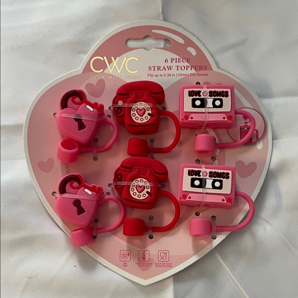 Set of 6 pink straw toppers by CWC. Includes heart, phone, and cassette designs.