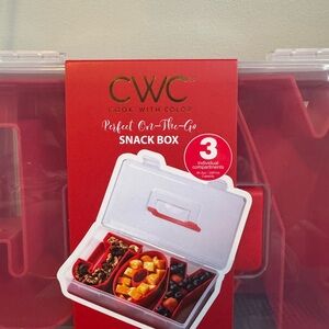 CWC snack box with three compartments. Perfect for on-the-go snacks. Vibrant red color. JOY