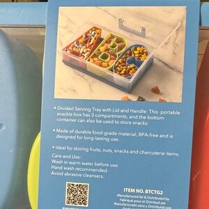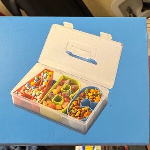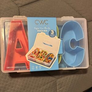 CWC snack box featuring A, B, C compartments. Perfect for organizing snacks. Includes red, green, and blue sections.