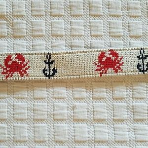 Cream needlepoint belt with red crabs and navy anchors. Nautical and preppy. Genuine leather backing. Antique gold hardware.