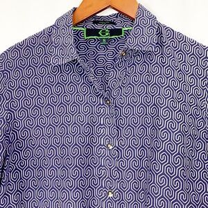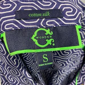 C. Wonder Blue and White Geometric Silk Cotton Blend Button Down Blouse In a size small in excellent condition. Perfect button down to go with your favorite pair of white ankle length pants or your favorite jeans - perfect preppy transitional top.