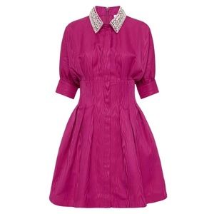 The Cynthia Mini Dress captivates with its distinctive features. Crafted from watermark taffeta, this mini shirt dress exudes luxury. A diamante collar adds a touch of elegance, while cuffed sleeves contribute a refined flair. The fitted waist with boning enhances the silhouette, and a concealed placket with self-covered buttons maintains a sleek appearance. The circular skirt boasts inverted tucks and a crinoline hem for added dimension. With full lining, this dress combines style and comfort seamlessly, making it a standout choice for special occasions.