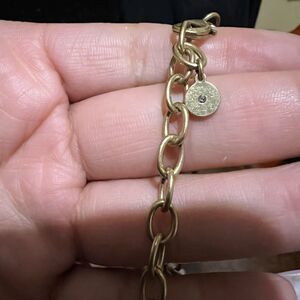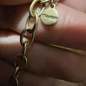 Genuine leather petals with neutral and metallic accents attach to a vintage gold chain. Vintage gold finish. Lobster Clasp Closure. 20" + 3" Extender.
