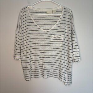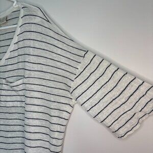 CYNTHIA ROWLEY 100% Linen Short Sleeve Tee Womens L V-Neck Navy Stripe Cream