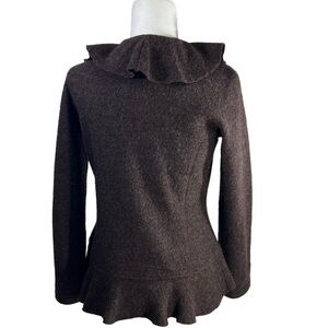 CYNTHIA ROWLEY 100% Wool brown cardigan with a waterfall ruffle neck line and rosettes on one shoulder the cardigan shirts in the front with a snap closure Woman’s size small.