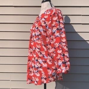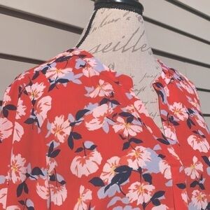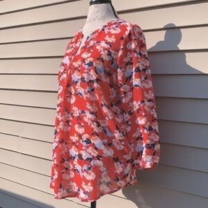Pretty watermelon colored 3/4 sleeve split chest blouse with a delicate floral print. Buttoned cuffs. Extra button attached. 100% polyester. Machine wash, line dry. Excellent used condition, there are no stains but there are 2 tiny snags. One on lower back side, and one on the front center. Please see pics. (As a side note pictures make this look orange, it’s not it’s a very pretty reddish pink)