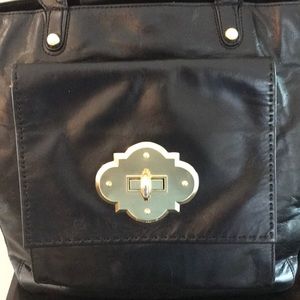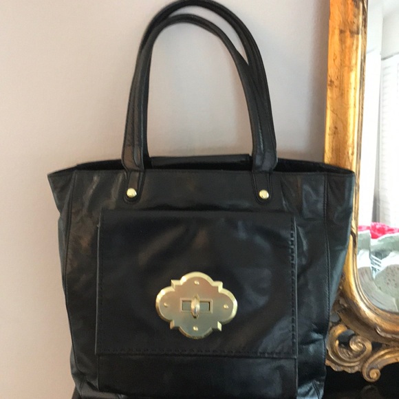 🔴💯CYNTHIA ROWLEY LARGE HANDBAG.RICH BLACK LEATHER WITH GOLD TONE HARDWARE STRAPS ARE SLIGHTLY PADDED FOR COMFORT. LARGE FRONT EXTERIOR POCKET THAT OPENS AND CLOSES IN FRONT OF THE BAG. AND ONE ZIPPERED EXTERIOR POCKET IN BACK.THERE ARE TWO INTERIOR POCKETS AND ONE ZIPPERED. SOME CREASING AND LIGHT SCRATCHES, EXTREMELY CLEAN INTERIOR.VERY GOOD PRE LOVED CONDITION. GREAT STATEMENT BAG.