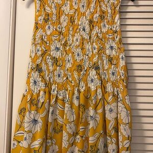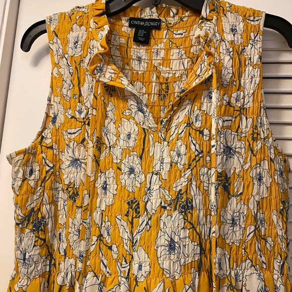 A very feminine, floral blouse in excellent used condition. Background is yellow with white flowers and blue stems. It’s 100% polyester and machine wash cold. Size: Medium