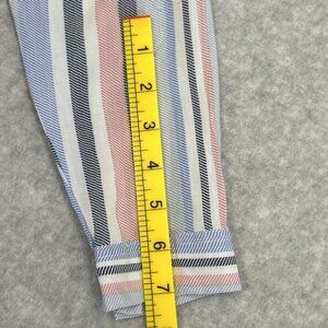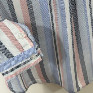 Stylish CYNTHIA ROWLEY rayon blouse in soft pastel stripes of blue, pink, white, and navy. Features a collarless V-neck with tacked front, faux wrap twist hem, and high-low silhouette. Lightweight and flowy with a roomy fit in the torso. Long sleeves with button cuffs and a pleat at the center back.