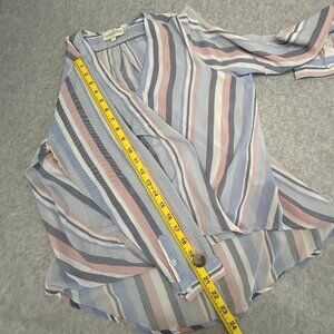 CYNTHIA ROWLEY Blouse Sz S Striped Rayon Faux Wrap V-Neck High Low Long Sleeve