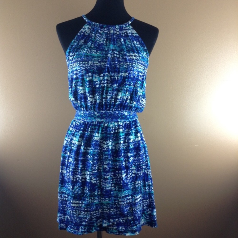 Good condition, no rips or holes. Beautiful bright shades of blue. With a wrap skirt front. Has elastic at the waist that is very stretchy to secure your hips. Spaghetti strap neck line, with keyhole on back. secured with a button closure. Dress is a size 6. SMOKE FREE HOMEđźš