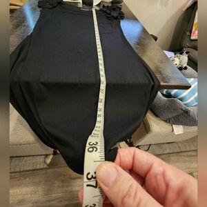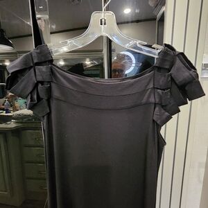 BEAUTIFUL BLACK DRESS BY CYNTHIA ROWLEY. IT HAS A LAYERED DESIGN, SHORT SLEEVED, AND HAS A FULL STRETCH.