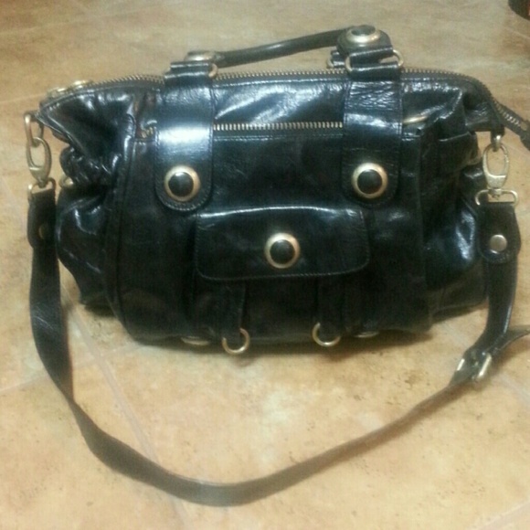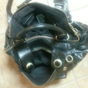Beautful bag!!Black leather,brass colored hardware.2 pockets on the outside zippered and cellphone pockets on the inside.only used twice very clean inside and out.JUST treated with leather cleaner.