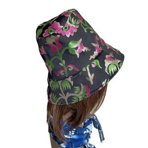 Black background with pastel colored floral pattern that looks embroidered but isn’t. It’s not raised in anyway it’s just part of the fabric. It’s a really nice sleek, feeling fabric. Featuring a higher crown than traditional bucket hats, and wider brim. Flat at the top. Gently worn.