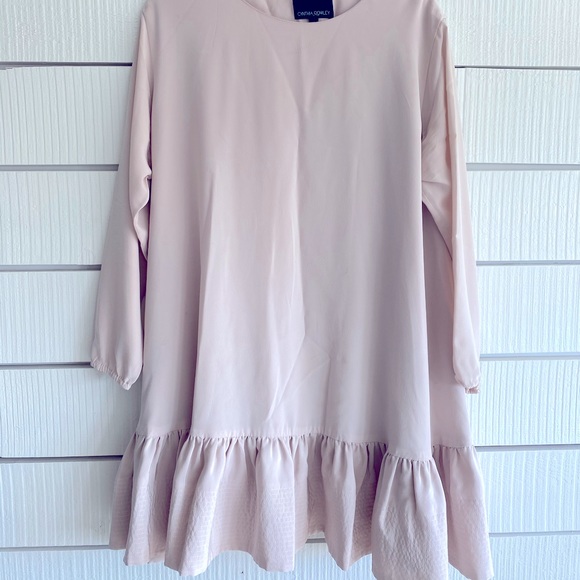 This drop hem pale pink dress is super cute and perfect to transition into the fall/winter months. This dress is so cute paired with leggings or knee high boots. It's very comfortable and super flattering! A few marks (as pictured) but still in great, wearable shape. Originally retailed for $395 so this is a steal!