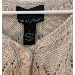 The Cynthia Rowley Short Sleeve Round Neck Cream Eyelet Cardigan Sweater in size L is a versatile and stylish addition to any woman's wardrobe. The cream color adds a touch of elegance, making it easy to pair with a variety of outfits. With its regular fit and short sleeves, this sweater is both chic and comfortable, ideal for layering over your favorite tops and dresses.