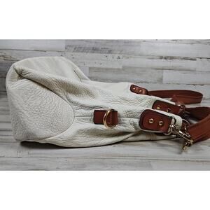 This Cynthia Rowley XL Ivory/Brown Pebbled Leather Convertible Satchel/Shoulder Bag is a stylish and versatile accessory for women. This extra-large bag features a rectangular shape with a pebbled finish in ivory color, accented with gold hardware. The bag includes multiple pockets, a lined interior, and a detachable cross-body strap for added convenience. With its sophisticated design and high-quality leather exterior, this bag is perfect for various occasions such as travel, casual outings, or business meetings. This bag does have some staining from use. Please see pics.