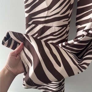 Zebra patterned ski suit in water repellent fabrication and flare leg silhouette