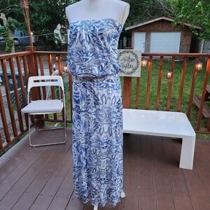 CYNTHIA ROWLEY blue floral print strapless Maxi mesh dress size S