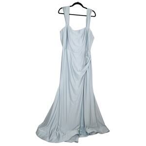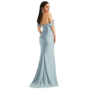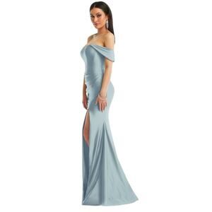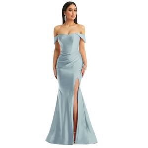 This Cynthia & Sahar “Scarlet” gown is a breathtaking floor length mermaid dress crafted from stretch satin in a soft mist blue shade. Designed with an off the shoulder neckline and structured corset bodice, this gown flatters the figure while offering elegant support. The high front slit adds a modern, striking touch, making it perfect for formal events, weddings, galas, or prom.