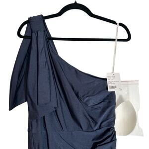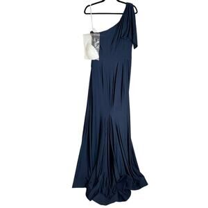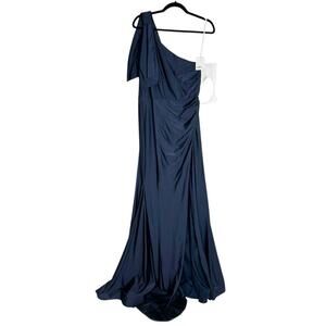 CYNTHIA & SAHAR Zaara One Shoulder Bow Satin Stretch Mermaid Gown Midnight Navy