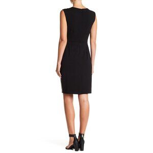 An artsy confetti print fronts a streamlined dress kept dark and monochrome in back for the most slimming fit.