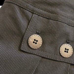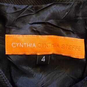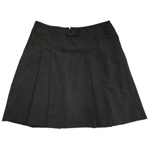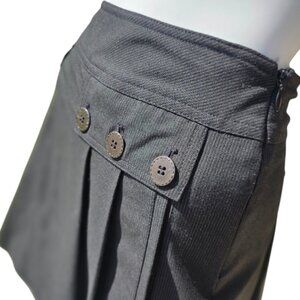 Reminiscent of a kilt, this black pleated skirt by CYNTHIA STEFFEE has gray pinstriping and a unique buckle accent on the back waist band. Front slash pockets. Side zip.One button needs securing otherwise excellent condition. No rips, tears, holes or stains.