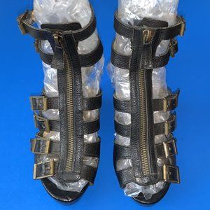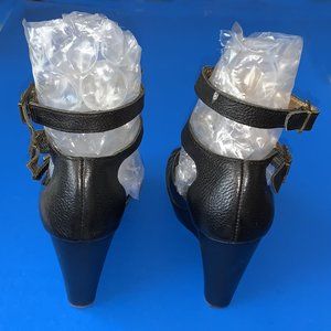 CYNTHIA VINCENT Black Front Zip Buckles Platform Wedge Shoes Sz 5.5